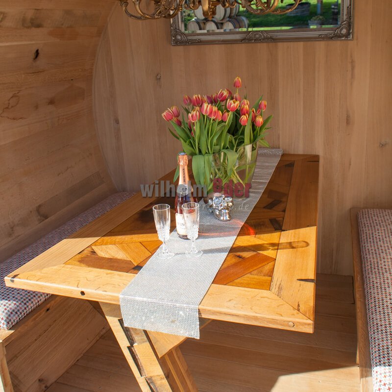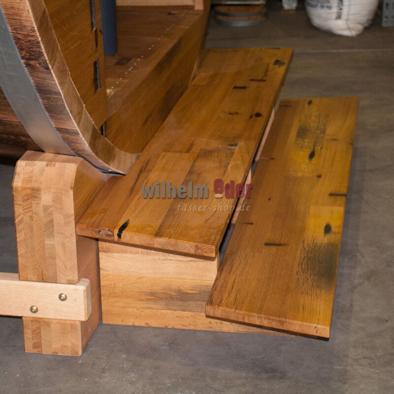 Now that the basic framework is in place, our team can begin with the interior work. The floor of the meeting points will also be built from used barrels. This is elaborately adapted to the rounding of the vat. However, because meetings are rarely held standing up and there is still enough space, which allows us to build in a table and two benches. These will also be covered with clear varnish again to ensure a long durability of the patina.