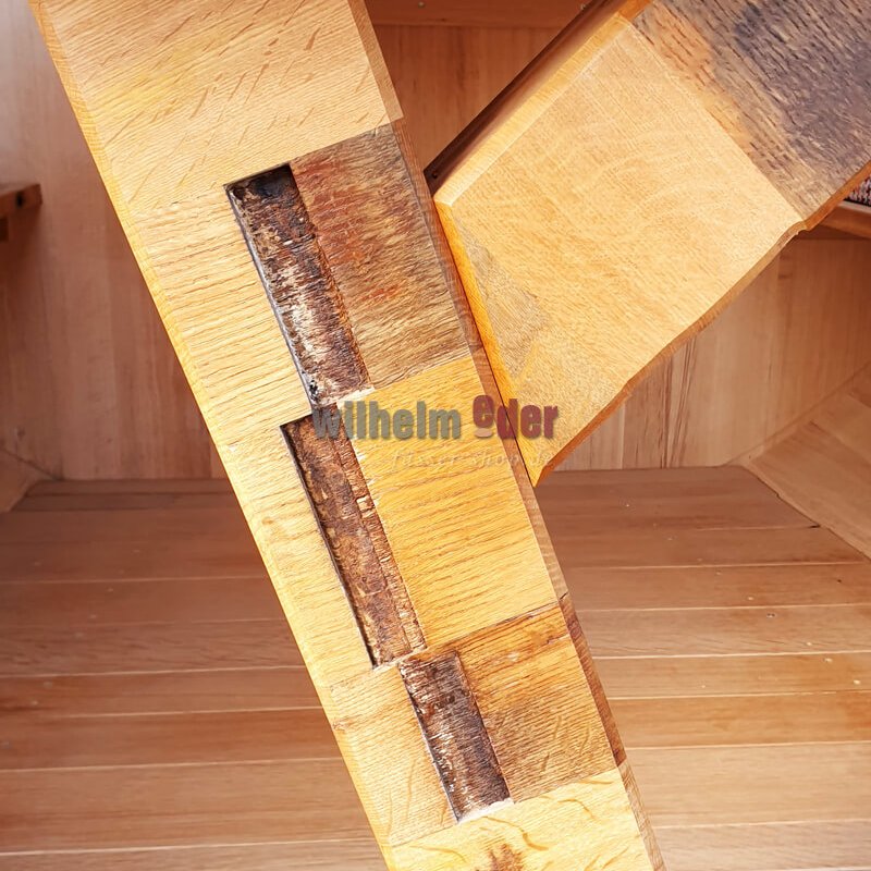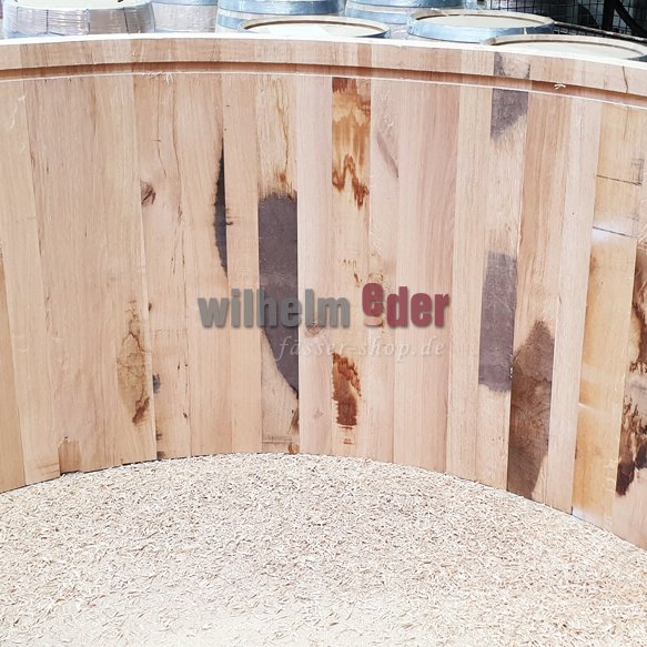 After a certain planning period, the 7000 – 10000 l vats are dismantled, the individual staves are dried and cleaned. Afterwards, each individual stave is ground down according to the customer’s specifications and the individual staves are then given a “vintage” look. For this purpose the wood surface is flamed with a gas burner and then sealed with a matt clear varnish.