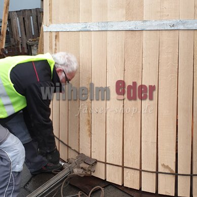 Then the individual staves are put together again to a tub. Gluing is only done partially, because we have to disassemble the staves again due to the space conditions at the final location.